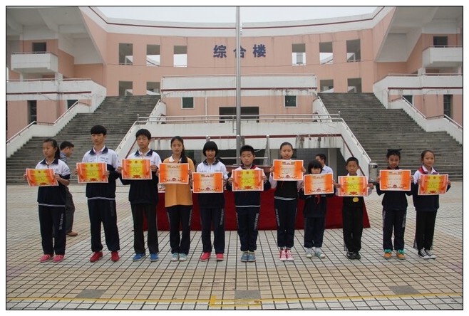 随后,运动员代表王宇杰同学发言,校长蓝育新、副校长颜建平、副校长唐友田、教科室主任刘建军为获得团体奖项的班级颁奖。