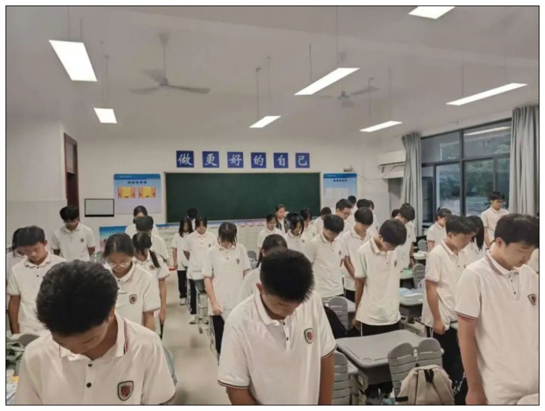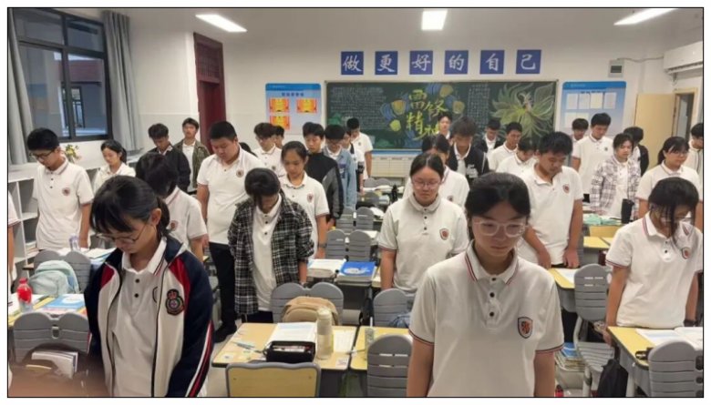 班会伊始, 7 时整的铃声落下,各班班主任同步宣布班会启动。全体学生起立,面向教室前方的国旗肃立,2511 班陈梓航同学以校主持代表的身份,通过校园广播同步引导各班级开展默哀仪式。“这三分钟的静默,是对遇难同胞的深切缅怀,更是对挺身而出的先烈们的由衷感恩。正是他们用血肉之躯筑起防线,才换来了我们今日安稳的学习与生活。” 班主任轻声引导,让师生们在凝重氛围中,不仅触摸到历史的厚重,更懂得感恩先烈的牺牲,深刻体会当下和平生活的珍贵,让 “感恩” 与 “铭记” 一同在青春心中刻下印记。