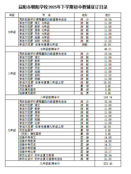 根据湖南省教育厅关于学校征订教辅材料“一科一辅”和自愿购买的原则,益阳市朝阳学校严格执行相关要求,选用的教辅材料均在湖南省教育厅制定目录内,结合学校的工作实际,现将我校2025级第一学期拟用教辅目录予以公示,接受家长及社会监督。