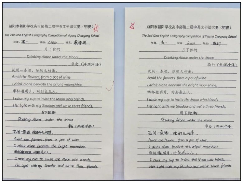比赛现场,学子们凝神创作:或调整 “酒”“邀” 的间架结构,或修正 “moonshine”“friends” 的笔锋弧度。赛后各班语英教师组成初评组,从书写、卷面、意境三方面打分,最终 130 余名学子晋级决赛,让诗意与书写之美漫溢校园。