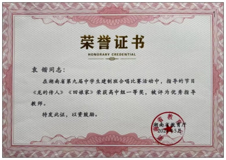 备战湖南省建制班合唱比赛时,他带着学生“死磕细节”:从合唱队形如何更显层次感,到和声如何更和谐。为了一个完美的收尾,他们曾在琴房排练到深夜,直到每个人的声音都能“拧成一股劲”,最终拿下一等奖,他也获评“优秀指导老师”。