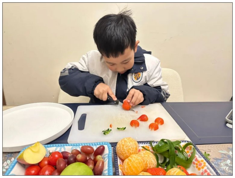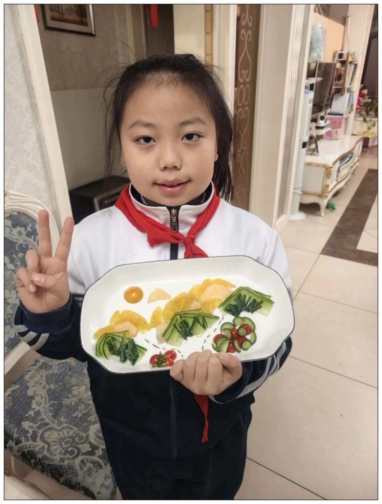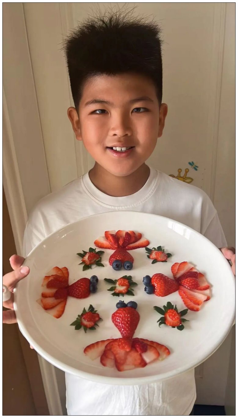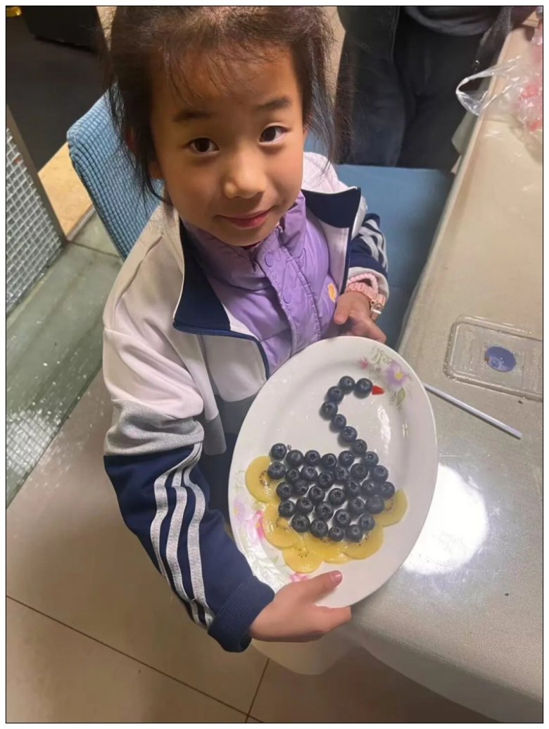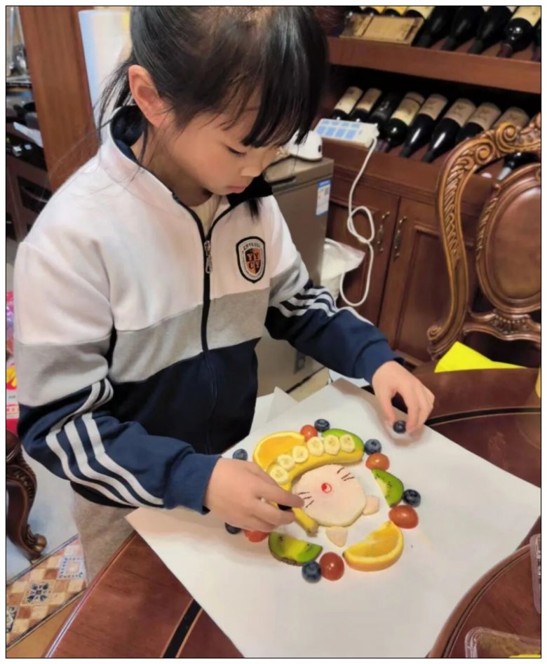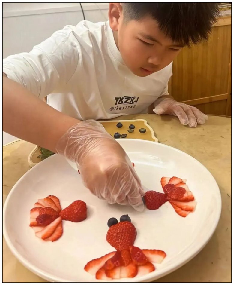 同学们利用课余时间在家精心筹备:挑选草莓、香蕉、小番茄等易操作的水果,手持安全刀,在家长的安全看护下,开启了“洗、切、摆”的创作之旅。大家脑洞大开,有的将草莓拼成锦鲤在盘中游弋,有的设计出“太阳花”绽放童趣,还有的打造出“四季组图”讲述季节故事……