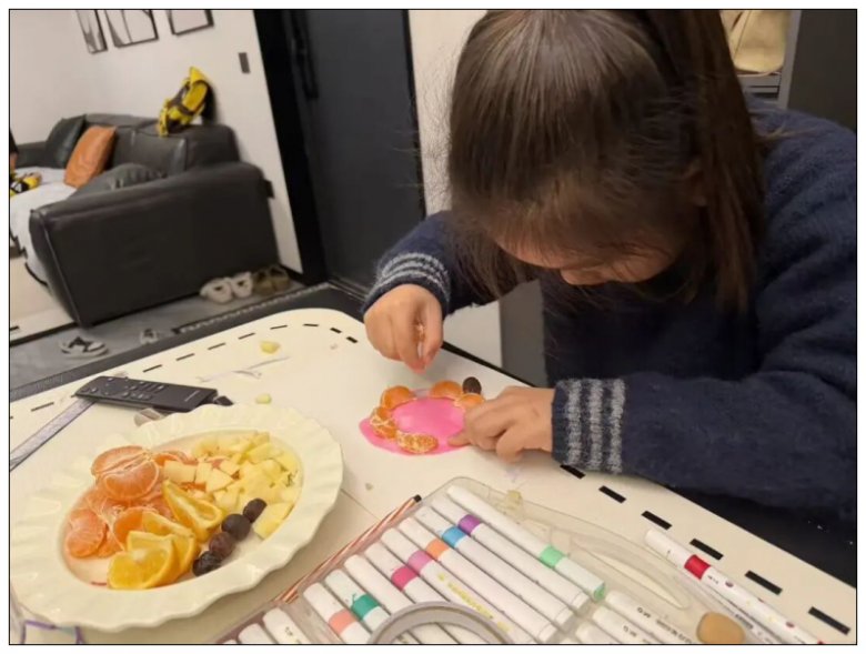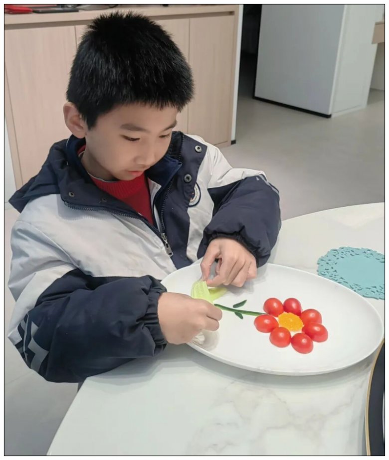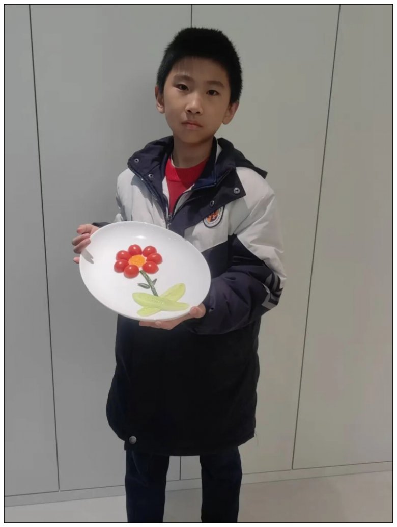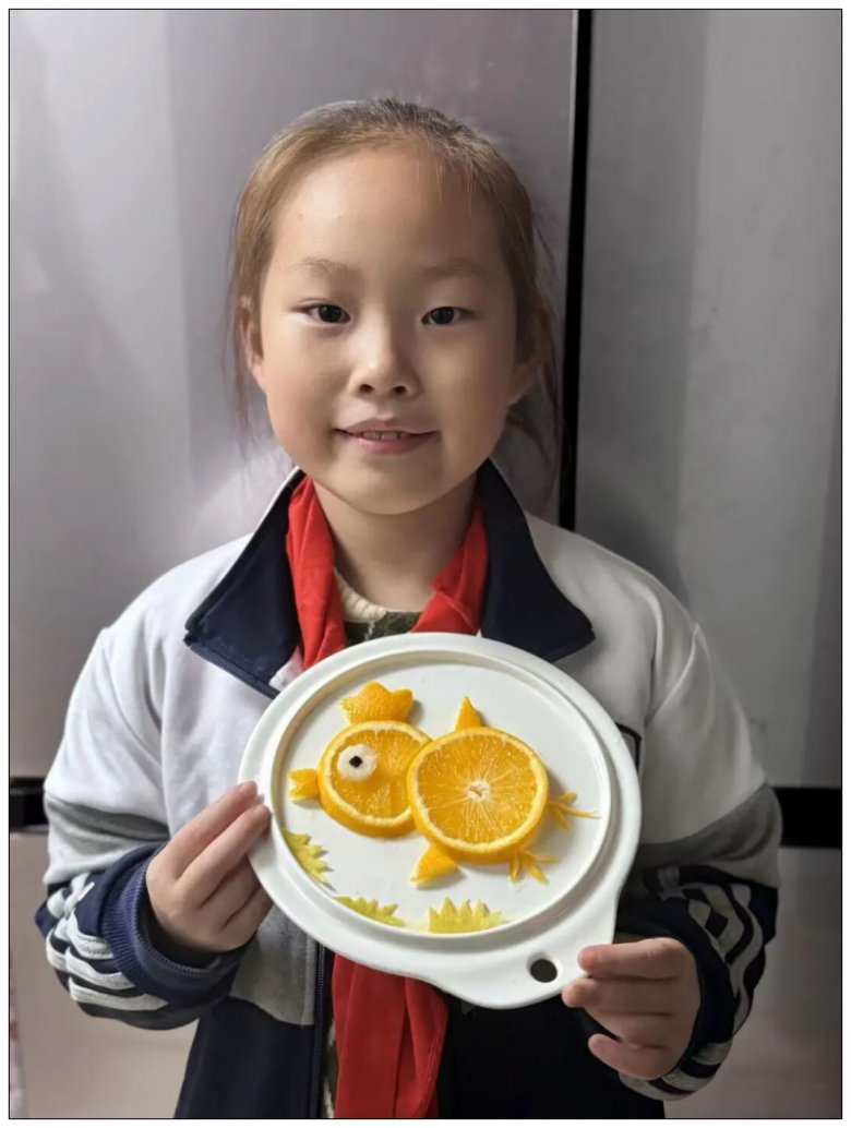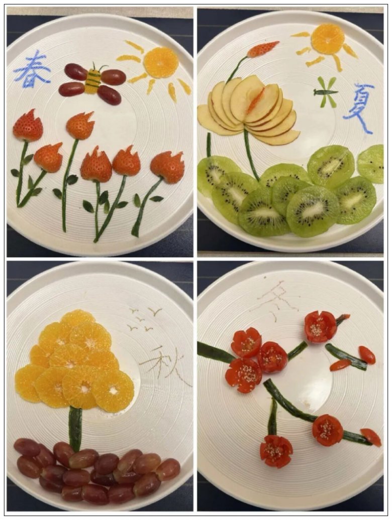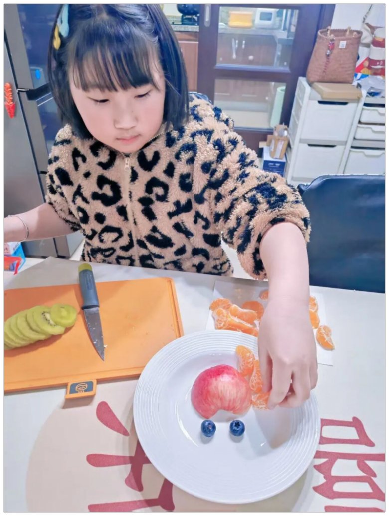 同学们利用课余时间在家精心筹备:挑选草莓、香蕉、小番茄等易操作的水果,手持安全刀,在家长的安全看护下,开启了“洗、切、摆”的创作之旅。大家脑洞大开,有的将草莓拼成锦鲤在盘中游弋,有的设计出“太阳花”绽放童趣,还有的打造出“四季组图”讲述季节故事……