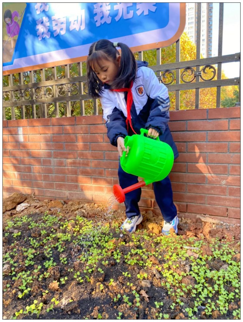 种植当天,劳动基地里一片忙碌景象。孩子们分工协作,翻土、挖坑、播种、覆土、浇水,每个动作都认真又专注。泥土沾满小手,汗水浸湿额头,却挡不住大家的热情,脸上满是对绿苗发芽的期待。