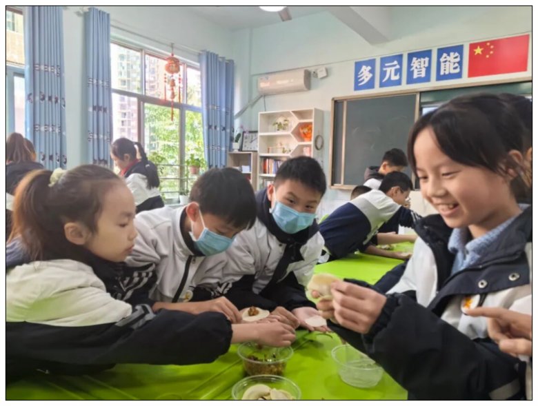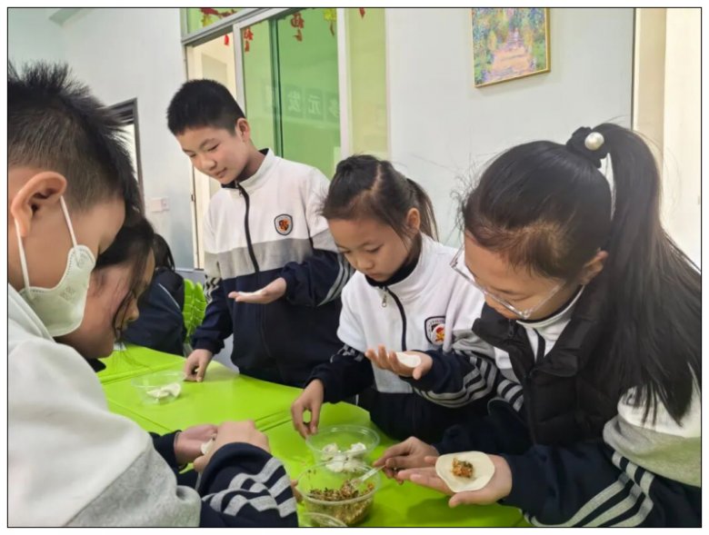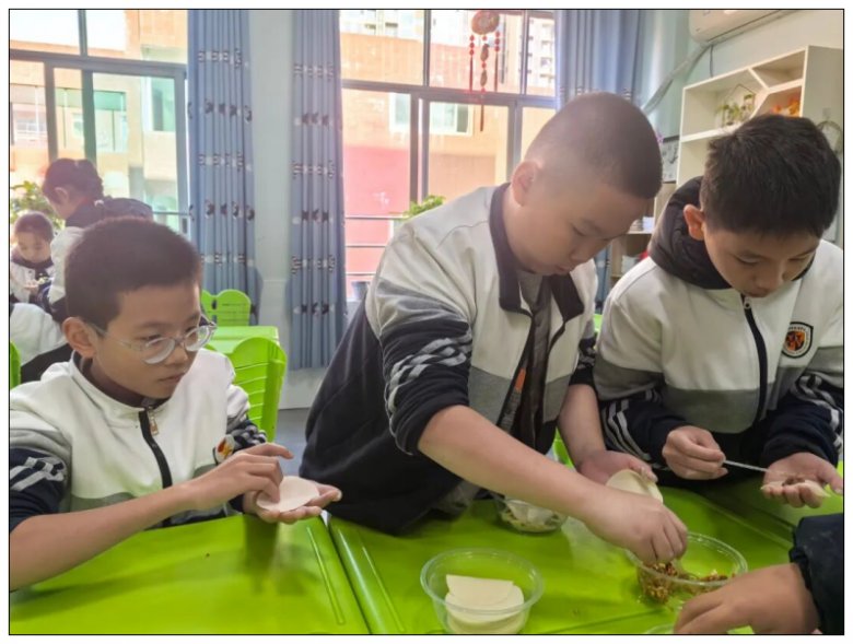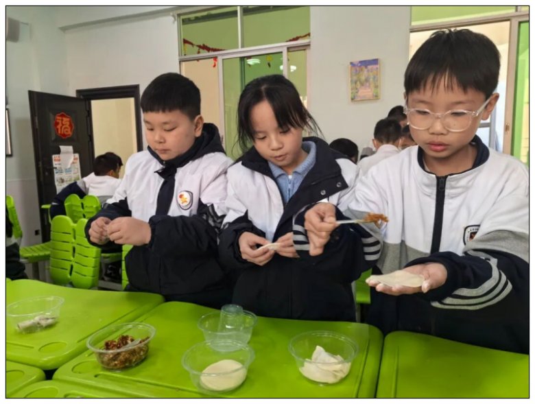 展示活动当天,课桌摆上了备好的饺子皮、各色馅料与餐盘,同学们围坐在一起,一场热闹的包饺子大赛正式拉开序幕。镜头里,孩子们低着头专注地摆弄着手中饺子皮。随着同学们的巧手翻飞,一盘盘形态各异的饺子很快成型。食堂的大铁锅里,饺子在沸水中上下翻滚,蒸腾的热气裹着鲜香扑面而来,弥漫在校园的每个角落。