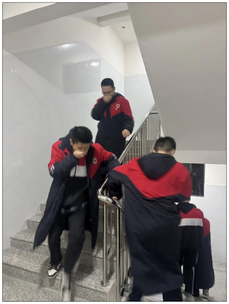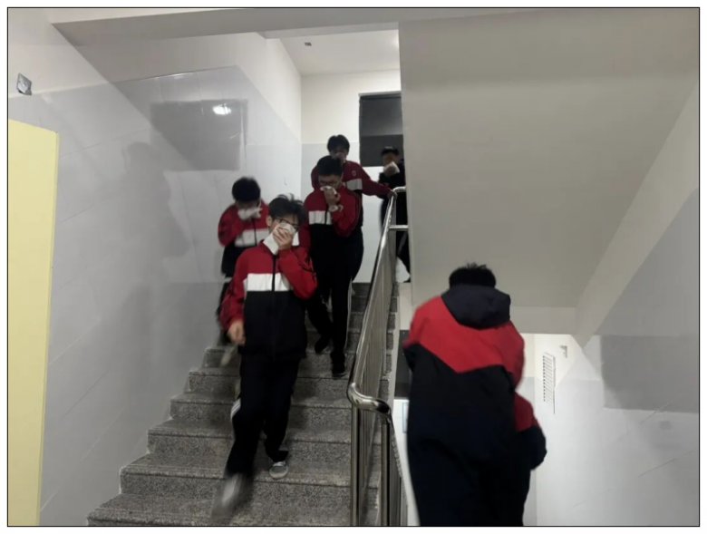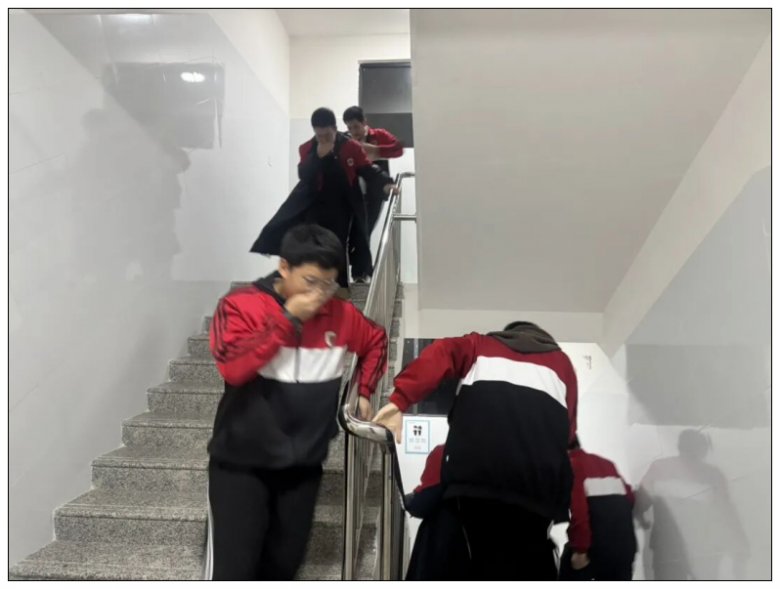 警报响起的瞬间,各宿舍内的住宿生迅速反应,捂住口鼻,弯腰低姿,在生活老师的引导下沿预定路线有序撤离。楼梯口、转角处的值守老师全程提醒安全事项,及时疏导人流,有效避免拥挤、踩踏风险。