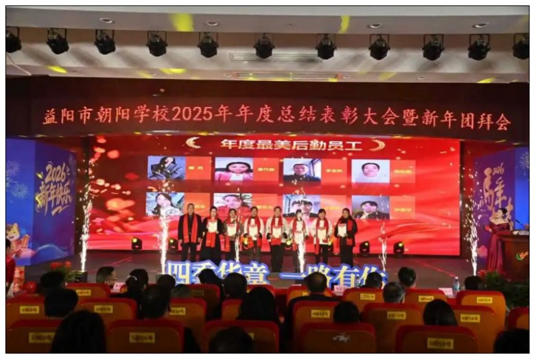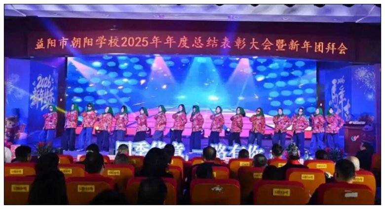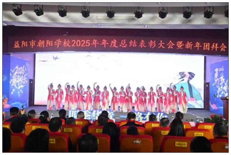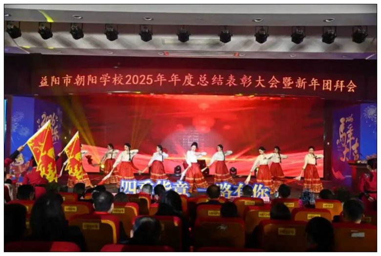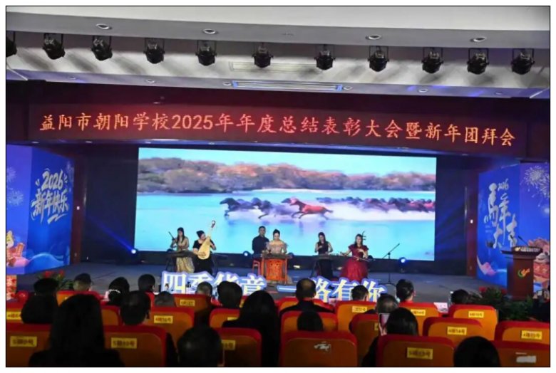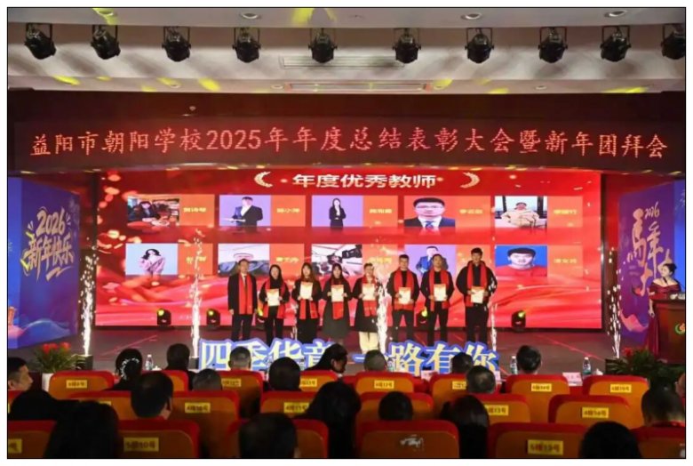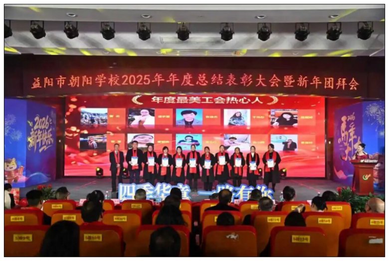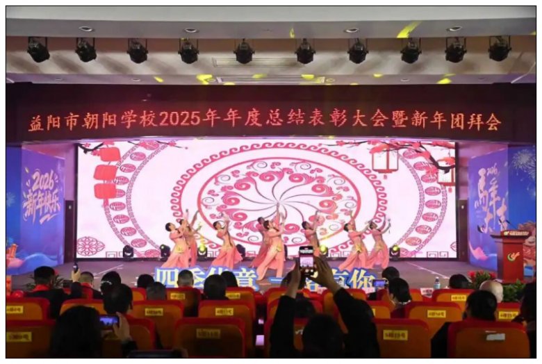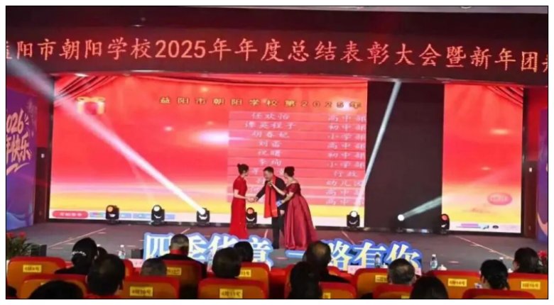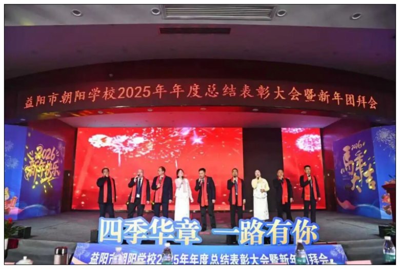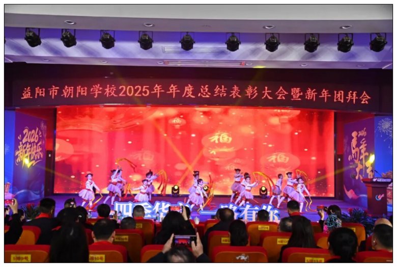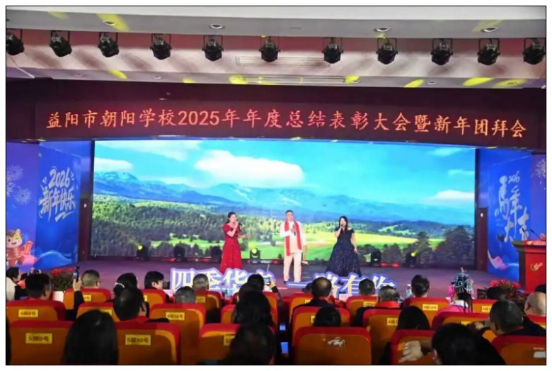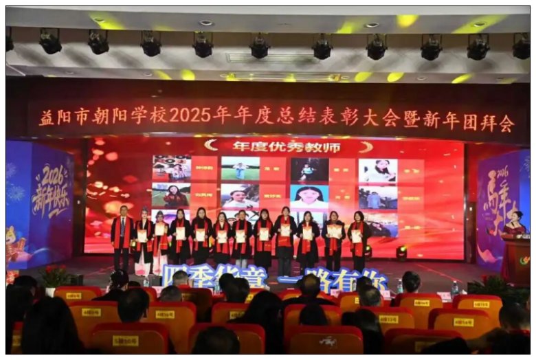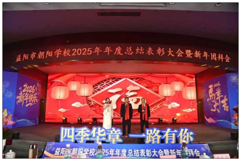 时光荏苒,岁月如歌,满载收获的2025年悄然落幕;四季更迭,华章日新,满怀希望的2026年如约而至。2月1日,益阳市朝阳学校报告厅暖意融融、灯光璀璨,全体教职工欢聚一堂,以“四季华章 一路有你”为主题,隆重举行2025年度总结表彰大会暨新年团拜会。