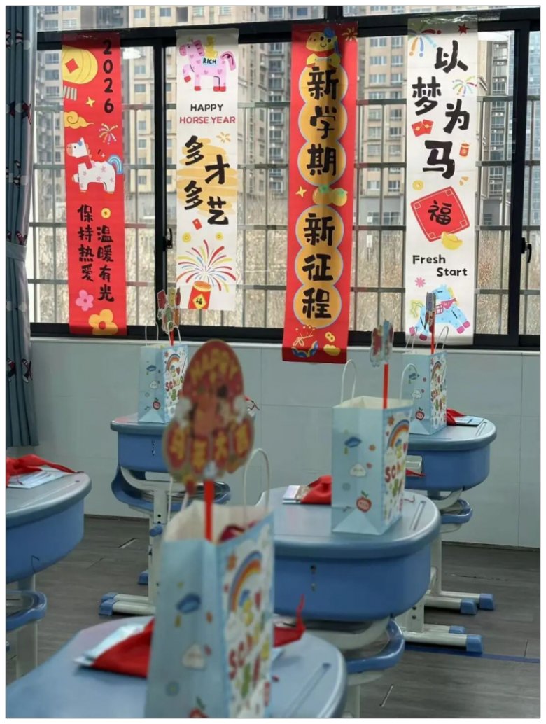 教室之内,暖意融融、氛围感拉满。为了给学子们营造温馨舒适的学习环境,老师们提前化身“设计师”,精心布置每一间教室。红彤彤的对联张贴整齐,寄托着对学子们新学期的美好期许;色彩斑斓的气球点缀其间,增添了浓浓的迎新气息;墙上的迎新标语醒目有力,“少年当有凌云志,不负时光不负己”“愿你乘风破浪,归来仍是少年”,一句句暖心话语,让教室成为充满爱与希望的“第二个家”,每一处细节都藏着老师们的巧思与温情,将开学仪式感拉满。