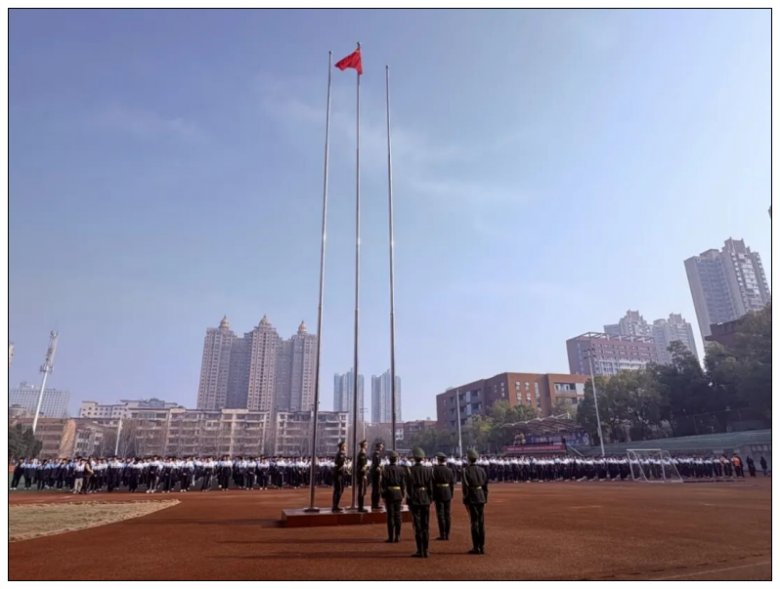 伴随着雄壮的《义勇军进行曲》,鲜艳的五星红旗在高中部国旗班同学的护卫下冉冉升起,全体师生肃立注目,齐唱国歌,心中激荡着对祖国的热爱与对新学期的憧憬。随后,全体师生共同唱响校歌《朝阳之歌》,悠扬的旋律回荡在校园上空,凝聚起奋进的力量。