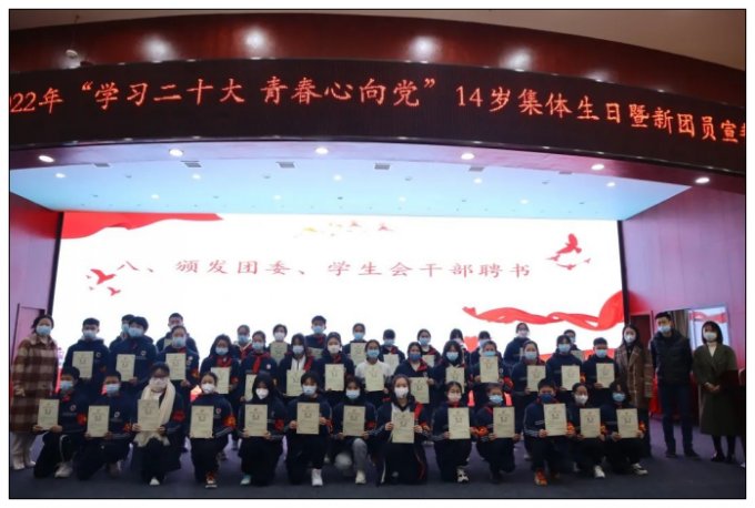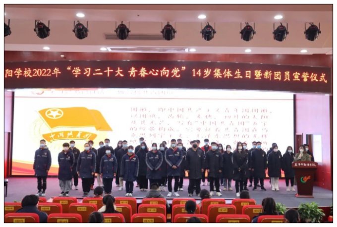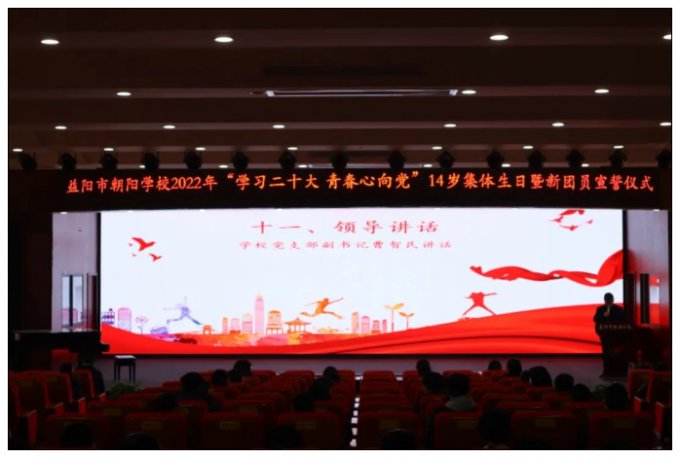 2022年12月14日,益阳市朝阳学校在报告厅举行“学习二十大 青春心向党”益阳市朝阳学校2022年新团员宣誓仪式暨14岁集体生日活动。学校团委精心策划,通过充满仪式感的朗诵、宣誓、切蛋糕等活动,为全体中学生献上了一份难忘的青春礼物。益阳市朝阳学校德育副校长颜建平、党支部副书记兼学校党政办主任曹智民、校长助理兼德育处主任刘启明、少先队大队辅导员章梦婷参加了此次活动。 仪式由团委书记江睿主持。