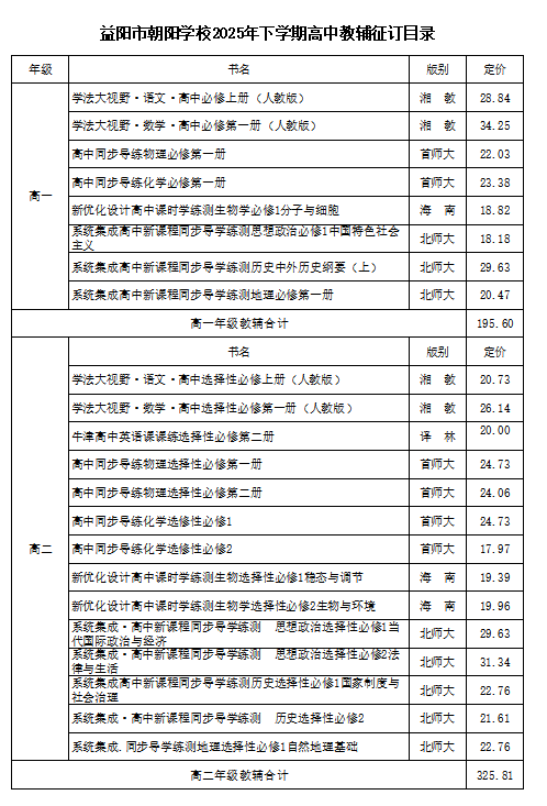 益阳市朝阳学校2025年秋季学期拟用教辅征订公示